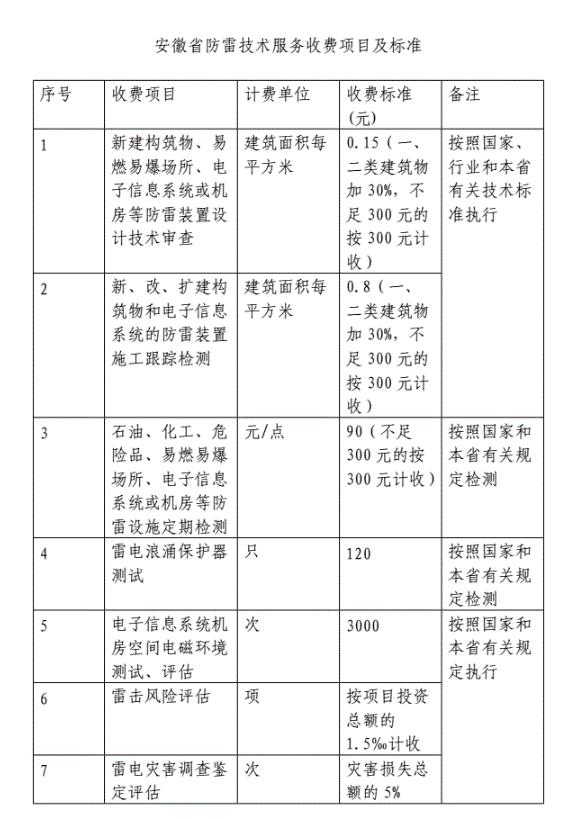 這個(gè)是安徽省地區(qū)的防雷服務(wù)收費(fèi),這個(gè)也是大概的收費(fèi)標(biāo)準(zhǔn),具體到不同建筑物上還是有所區(qū)別,如果有防雷檢測(cè)相關(guān)需求,歡迎咨詢安徽中普防雷,咨詢熱線:400-699-0050.